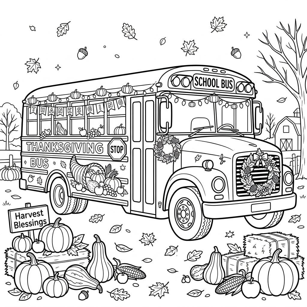 Unleash your creativity as you bring this Thanksgiving masterpiece to life! Experiment with a rich palette of autumn hues: think deep oranges for the pumpkins, vibrant reds and yellows for the leaves, and earthy browns and greens for the bus and natural elements. Consider using shading techniques to add depth to the cornucopia's bounty and texture to the hay bales. Don't hesitate to use metallic pens or glitter for a touch of sparkle on the decorations, making this festive school bus truly shine. Let your imagination drive this colorful harvest parade!
