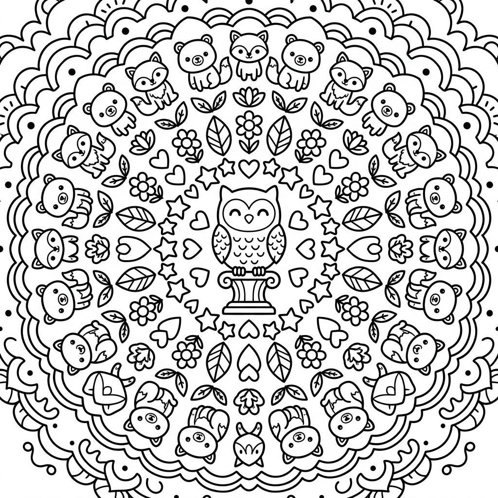 Dive into the whimsical world of this kid-friendly mandala coloring page, where nature's charm meets intricate design. At its heart sits a joyful owl, perched serenely on a decorative pedestal, almost like a friendly forest sculpture inviting you to color. Radiating outwards, you'll discover concentric rings filled with adorable forest creatures – happy bears and sly foxes – playfully nestled amongst delicate flowers, cheerful leaves, sparkling stars, and sweet little hearts, all forming a perfectly symmetrical circular pattern.