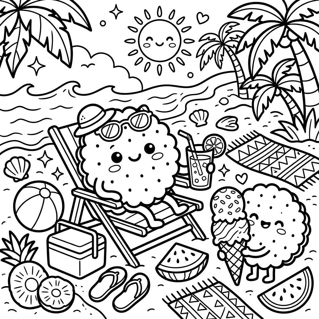This charming coloring page invites you to imagine yourself on a perfect summer getaway, surrounded by the cheerful antics of our adorable sea biscuits. One is lounging in style in a beach chair, sporting cool shades and a sun hat, while happily sipping a tropical drink. Beside them, another cute sea biscuit is ready to share the joy, holding a tempting ice cream cone, perfectly capturing the essence of a relaxed vacation. The scene is completed with all the essentials for a fun day: a beach ball, a handy cooler, juicy slices of pineapple and watermelon, and comfy flip-flops, all set against a backdrop of swaying palm trees and sparkling waves.