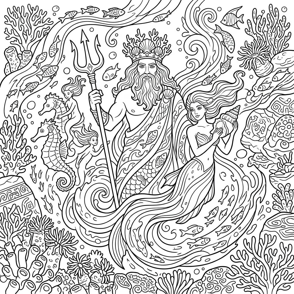 Embark on an epic journey to the mythical depths with this stunning coloring page featuring powerful sea gods and graceful spirits. Discover an intricate underwater world waiting for your vibrant artistic interpretation.