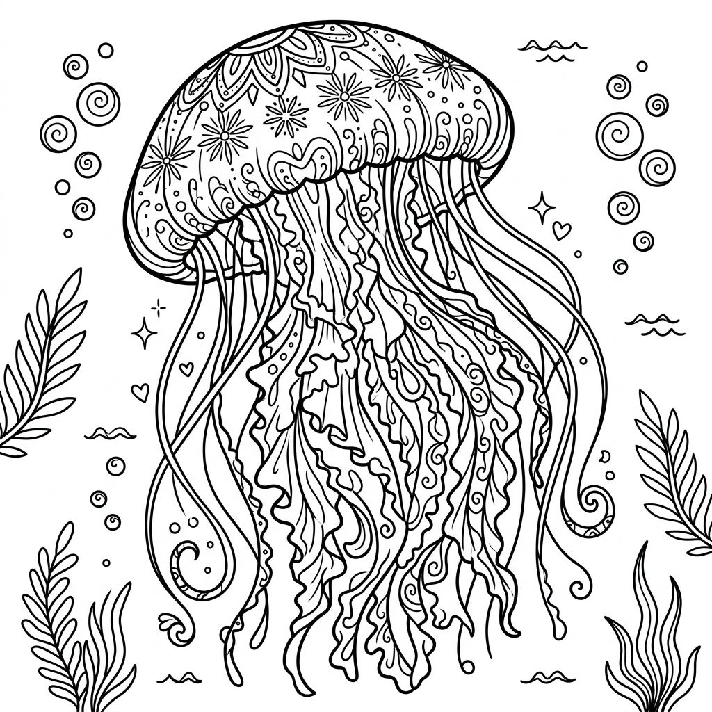 Whether you choose realistic ocean hues or vibrant fantastical shades, this design provides endless creative possibilities. Experiment with various coloring mediums – colored pencils for fine details, markers for bold statements, or even watercolors for soft blends on the bell. Pay attention to the subtle background elements like bubbles and swirling plant life, which add depth and enchantment to your finished masterpiece. Share your uniquely colored jellyfish with the world!