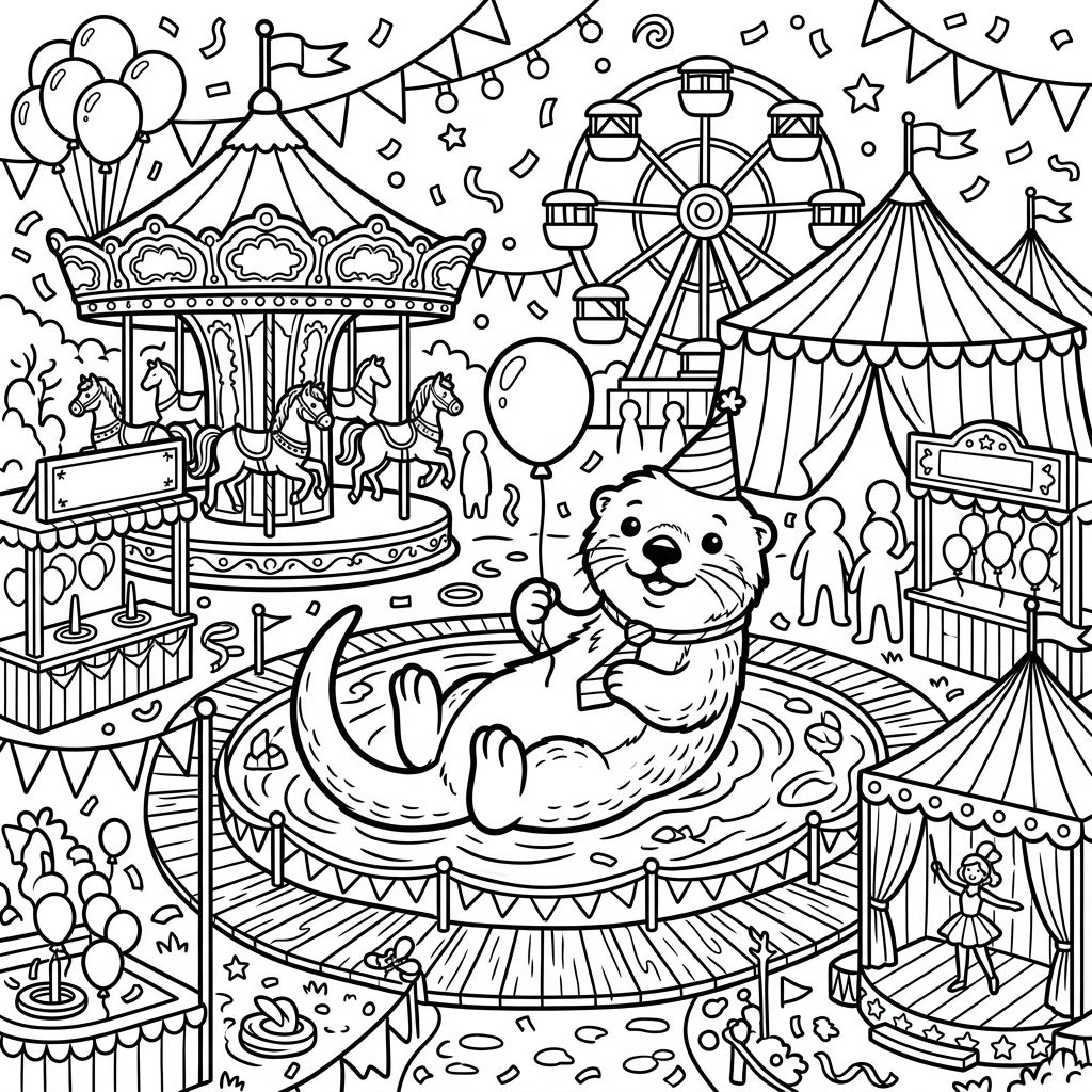Get ready for a splash of fun with this delightful sea otter enjoying a vibrant carnival! This detailed coloring page is packed with festive attractions, from carousels to Ferris wheels, promising hours of creative entertainment.