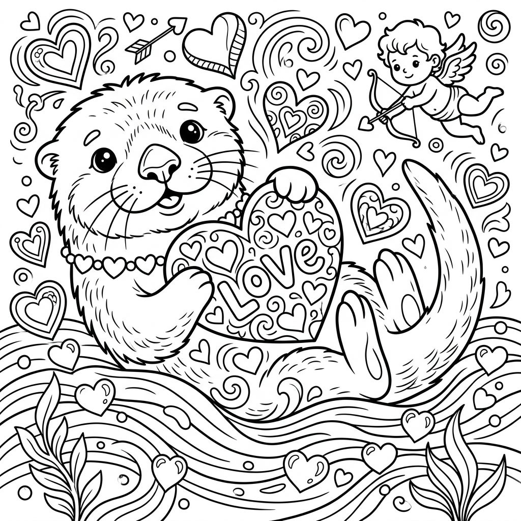 Unveil the charm of the ocean with this exquisite coloring page, showcasing an endearing sea otter gracefully floating on its back. This adorable marine mammal lovingly clutches a large, intricately patterned heart, proudly proclaiming 'LOVE' amidst a flurry of smaller heart designs. A delicate heart-shaped necklace adorns its neck, adding to its sweet demeanor, while a mischievous Cupid hovers nearby, ready to spread affection with his bow and arrow, all nestled among gentle waves and aquatic plants.