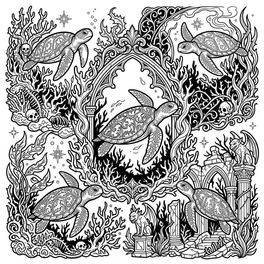 Embark on an extraordinary coloring journey with this captivating template, merging the serene beauty of sea turtles with the dramatic elegance of gothic artistry. This intricately detailed illustration showcases five majestic sea turtles gracefully navigating a labyrinthine underwater landscape. Ornate gothic arches, crumbling ruins, and twisted coral formations create a fascinating backdrop, dotted with subtle macabre elements like skulls that add to its unique charm.