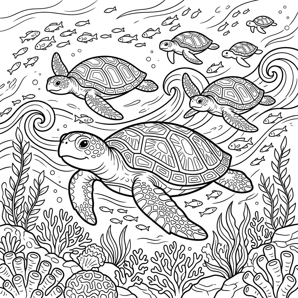 This captivating coloring page invites young artists to explore the wonders of the ocean during a thrilling sea turtle migration. Featuring several charming sea turtles, from large, friendly adults to playful juveniles, this illustration captures the essence of their long-distance journey. The intricate details of their shells and flippers are perfect for bringing to life, while the surrounding underwater world teems with stylized coral reefs, flowing seaweed, and schools of tiny fish, creating a rich and immersive scene.