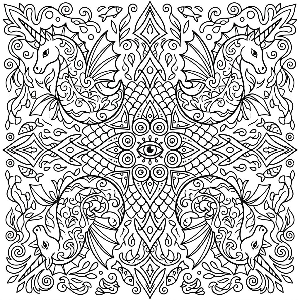 Consider a palette of cool blues, greens, and purples to capture the aquatic theme, perhaps adding iridescent or pearlescent accents to highlight the unicorns' scales and horns. Experiment with different shades to create depth within the mandala's layers, making the central eye truly pop. Whether you prefer vibrant hues or soft pastels, this Sea Unicorn Mandala invites you to explore endless color possibilities and create a truly magical piece of art.
