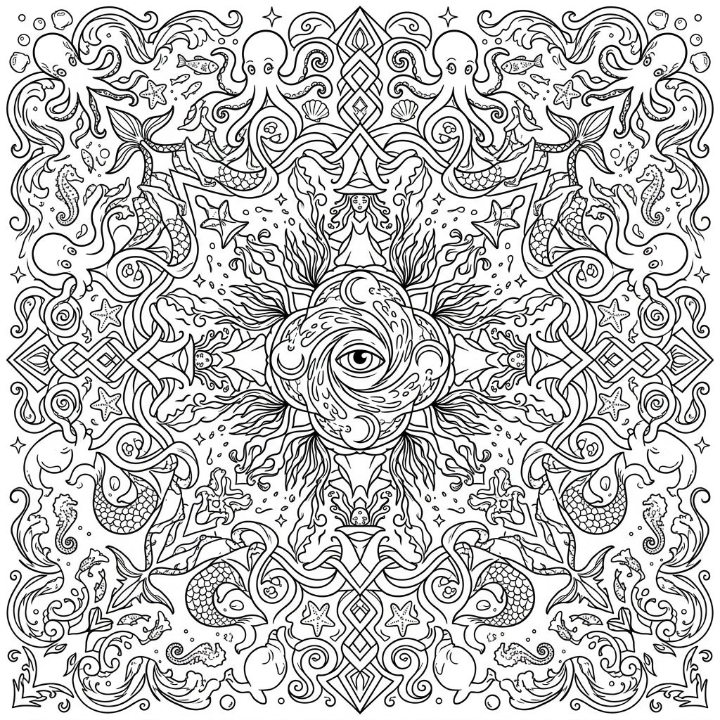 Immerse yourself in a mesmerizing world with this detailed Sea Witches Mandala coloring page. At its heart lies a mystical eye, acting as the epicenter from which a complex, symmetrical universe unfolds. Observe the graceful mermaids, their scaled tails woven into the radial design, alongside curious octopuses with their swirling tentacles, elegant seahorses, and a scattering of starfish and shells, all intricately intertwined with flowing seaweed and delicate patterns reminiscent of Celtic knots. Every element contributes to a harmonious, expansive tableau designed to captivate your imagination.