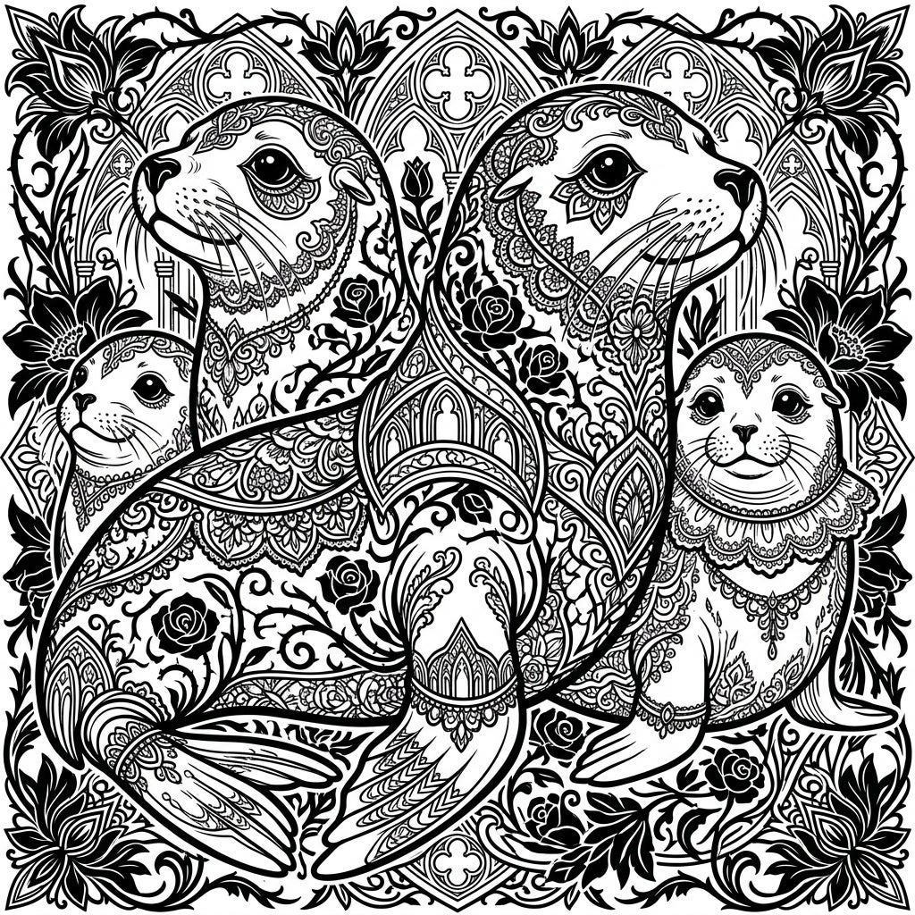 Bring these mysterious creatures to life with your chosen hues. Consider using deep purples, emerald greens, and rich blues for the seals, contrasting with silvers, greys, or even subtle crimson for the intricate patterns. Experiment with shading to enhance the dramatic shadows and highlight the delicate lacework. Download this extraordinary coloring page and let your imagination craft a masterpiece that blends the wild beauty of the ocean with timeless Gothic elegance.