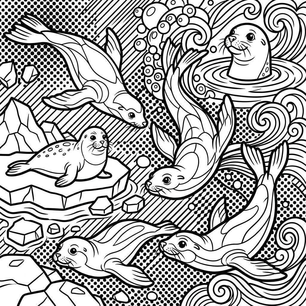 Immerse yourself in an exciting aquatic scene where graceful seals and majestic sea lions come to life through the vibrant lens of Pop Art. This intricate coloring template showcases several pinnipeds in dynamic poses: some frolic playfully underwater amidst swirling waves and bubbles, while others rest serenely on jagged ice floes. Each creature is meticulously outlined, ready for your creative touch to bring out their unique personalities and the lively energy of their marine habitat.