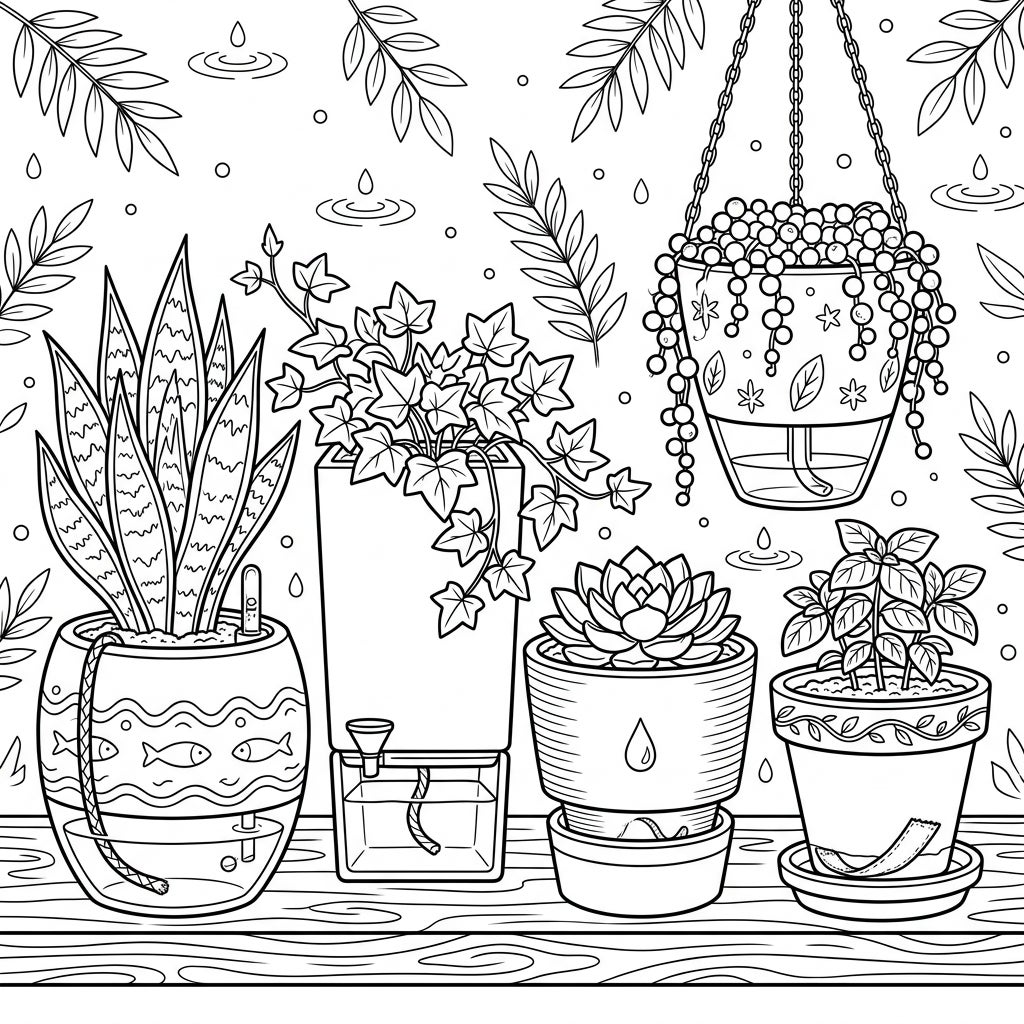 Explore a charming collection of self-watering planters, each thoughtfully designed to keep plants thriving. This intricate coloring page invites you to discover the beauty of plant care and innovative gardening solutions.