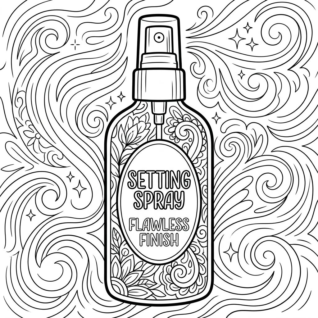 Step into a world of calming creativity with this exquisite setting spray coloring page, thoughtfully designed for seniors. The central focus is a gracefully depicted setting spray bottle, featuring a prominent label that reads 'SETTING SPRAY FLAWLESS FINISH' in easy-to-read lettering. Adorning the bottle itself are intricate yet distinct floral motifs, adding a touch of elegance and detail. The entire illustration is rendered with thick, clear outlines, ensuring every section is easily distinguishable and enjoyable to color.