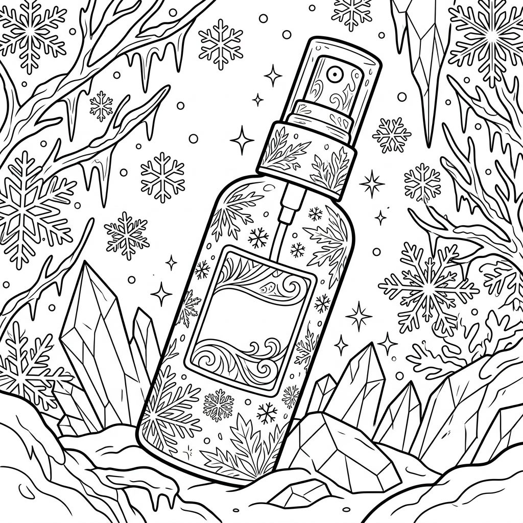 Immerse yourself in the frosty beauty of this unique coloring template, featuring a stylish setting spray bottle. The bottle itself is intricately designed with elegant snowflake patterns and delicate leaf motifs, offering a blend of natural beauty and cosmetic charm. Surrounding this central element, a mesmerizing winter landscape unfolds, adorned with large, detailed snowflakes, jagged ice crystals, and branches glistening with frozen icicles, all waiting for your artistic touch.