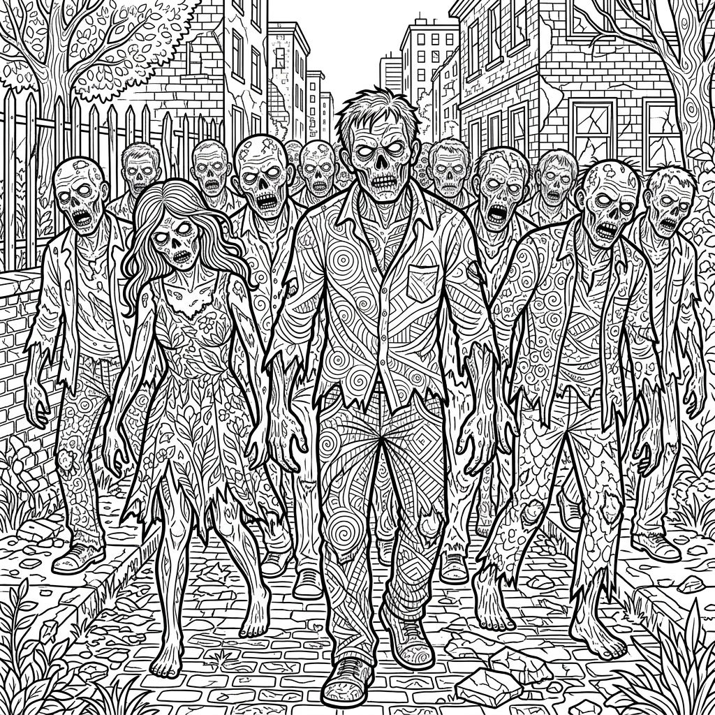 Step into a meticulously detailed world of the undead with this adult coloring page featuring a relentless horde of shambling zombies. Each zombie, from their decaying faces to their tattered clothing, is rendered with intricate patterns and textures, offering an exceptional challenge for experienced colorists. They march through a desolate city street, past crumbling buildings, broken fences, and gnarled trees, setting a truly immersive and eerie scene.