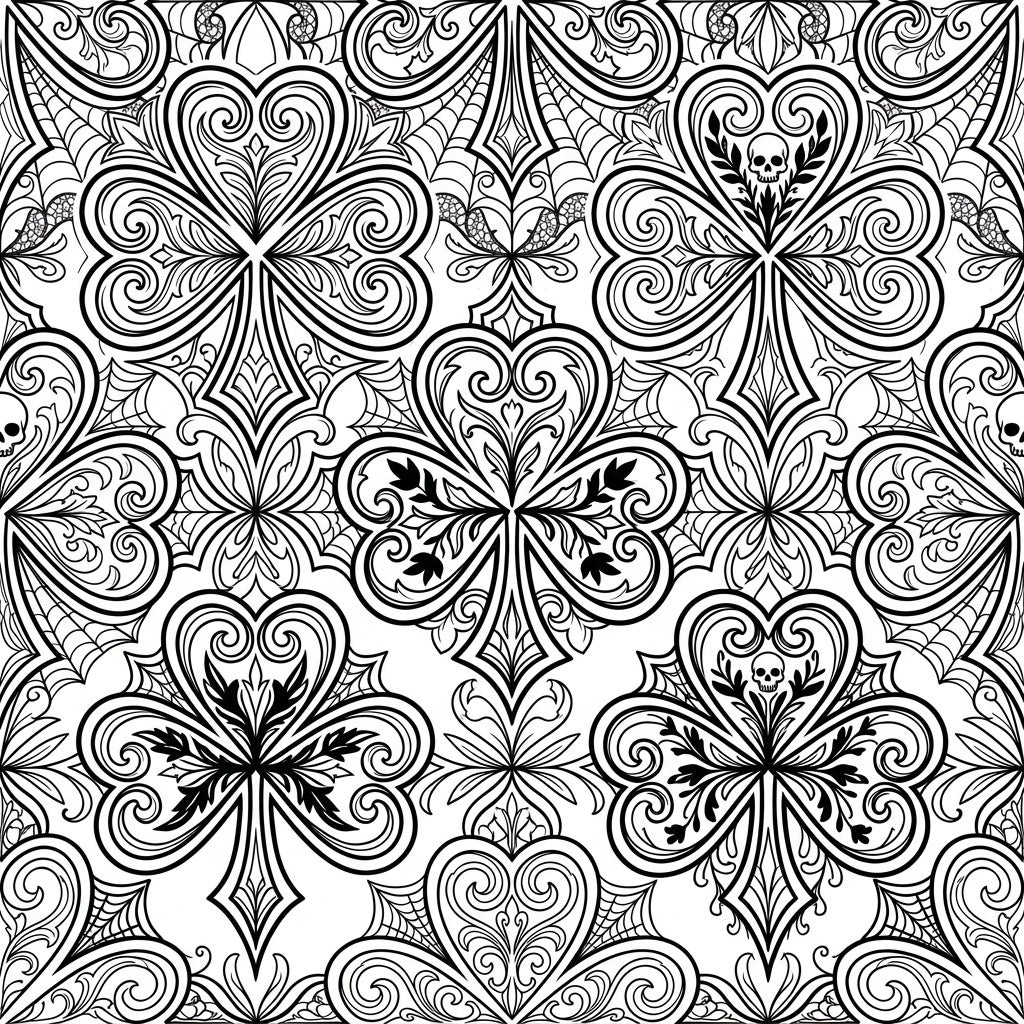 Step into a realm where luck meets shadow with our Gothic Shamrock Emblems coloring page. This intricate design features a mesmerizing repeating pattern of highly stylized shamrocks, each leaf adorned with delicate swirls and heart-like curves. Interspersed throughout the pattern, subtle skulls and delicate spiderwebs add a touch of macabre charm, creating a rich tapestry of interwoven Gothic motifs and intricate details that beg for your creative touch.