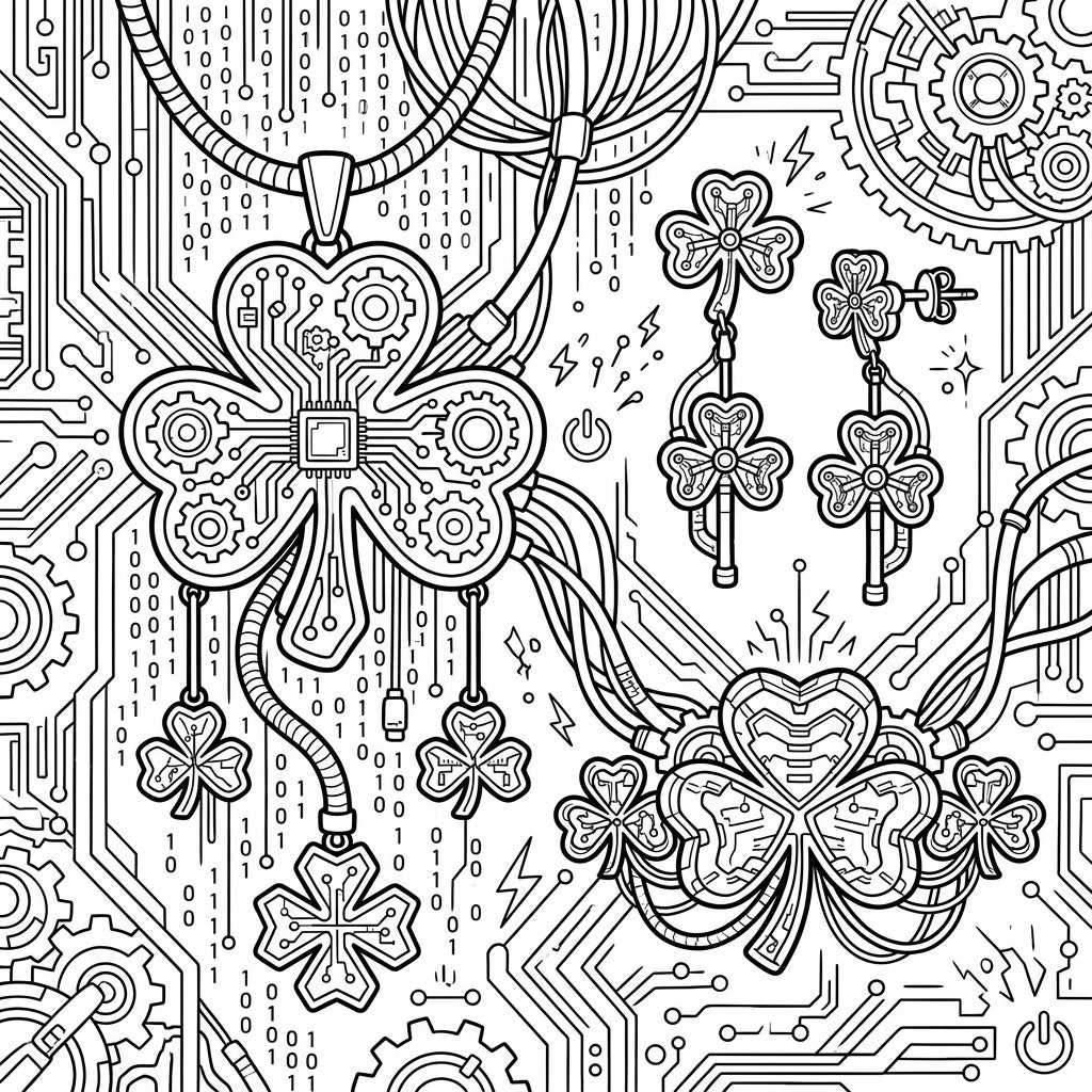 This coloring template masterfully blends the traditional charm of shamrocks with the edgy, neon-infused world of cyberpunk. The entire page is a dense tapestry of binary code, interwoven cables, and circuit board traces, creating an immersive backdrop for these extraordinary pieces of jewelry. It evokes a sense of rebellious futurism, inviting colorists to imagine a world where good fortune is coded into every circuit and style is powered by innovation. Perfect for those who love sci-fi, technology, and a touch of Irish spirit.