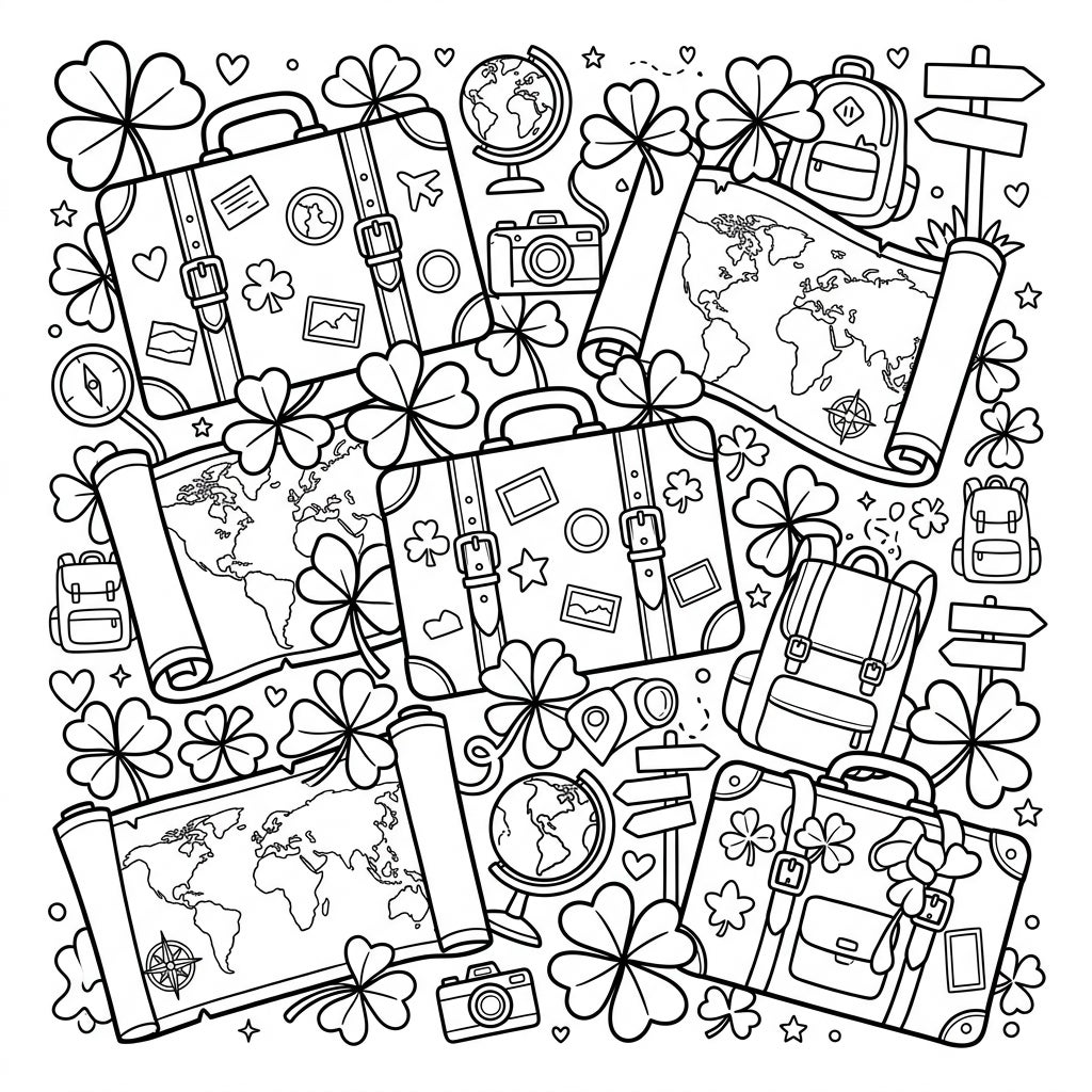 Pack your bags for a whimsical adventure with this unique coloring page, blending the luck of shamrock leaves with the thrill of vacation travel. Discover a delightful design filled with suitcases, maps, and exploration symbols, perfect for creative minds.