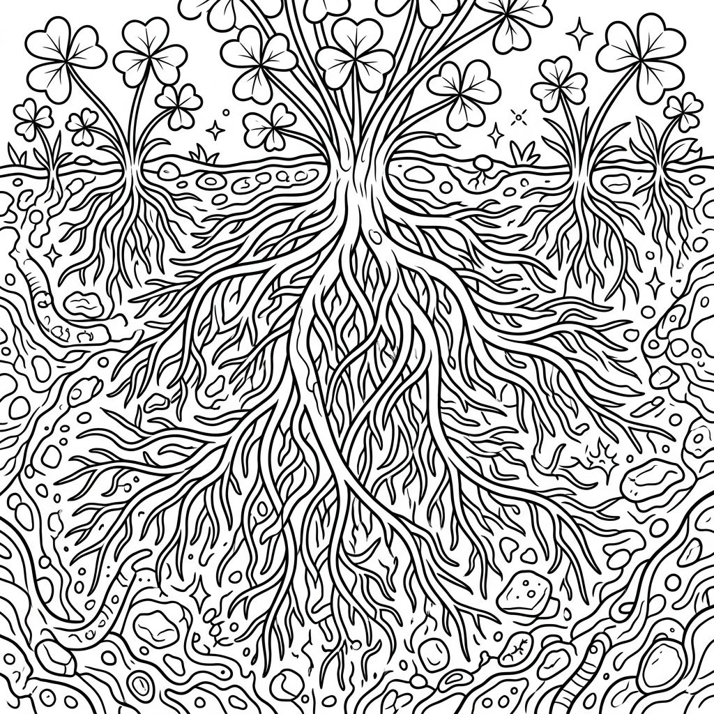 Journey beneath the surface with this mesmerizing coloring page featuring the intricate root system of a vibrant shamrock plant. This detailed illustration presents a dense network of intertwining roots, spreading across the entire canvas. Observe the larger central root structure alongside smaller shamrock plants, all anchored firmly in the earth, offering a rich tapestry of organic lines and shapes to explore with your colors.