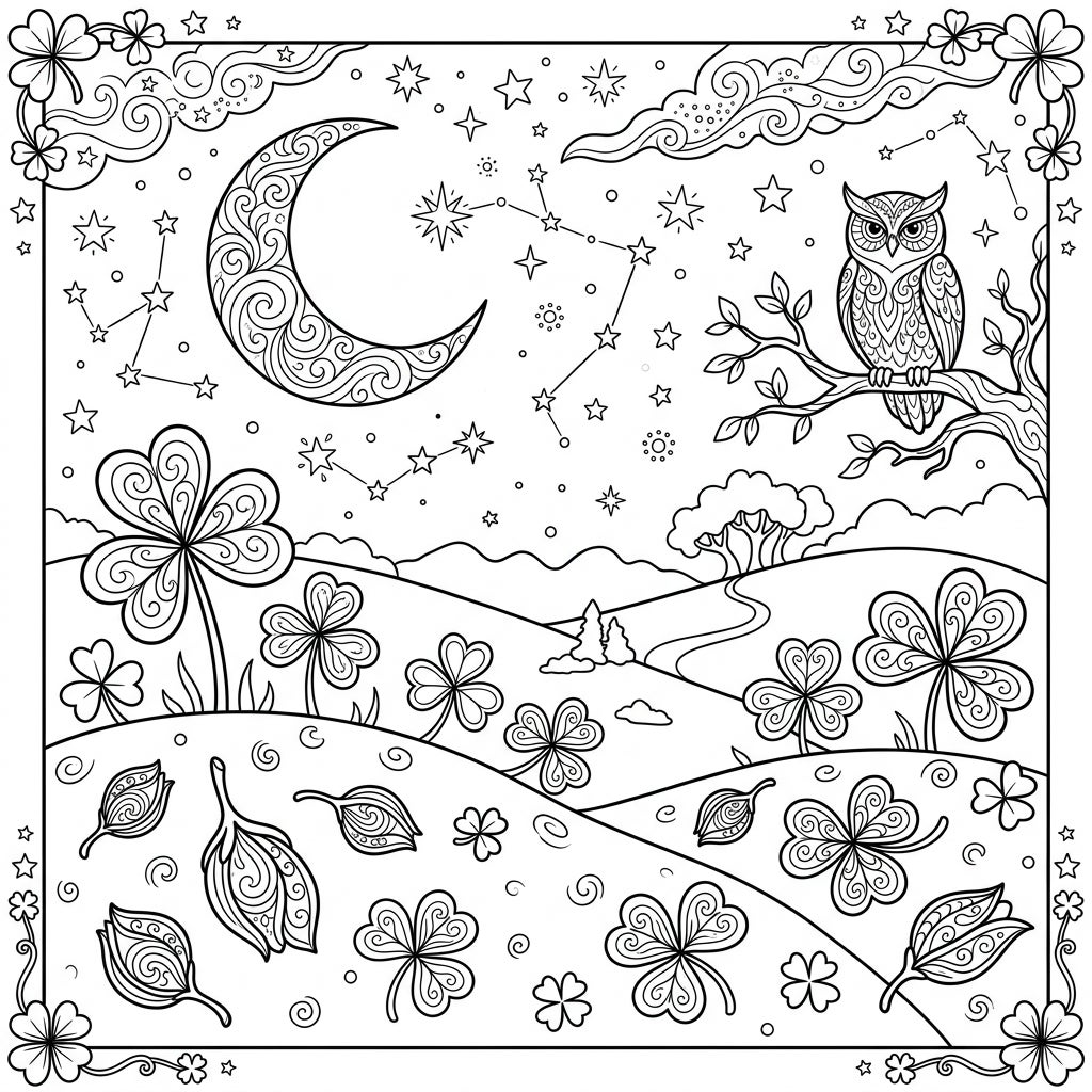 Discover a captivating night scene where intricate shamrocks flourish under a mystical sky. This unique coloring page features a wise owl, a decorative crescent moon, and sparkling stars, perfect for a peaceful artistic escape.