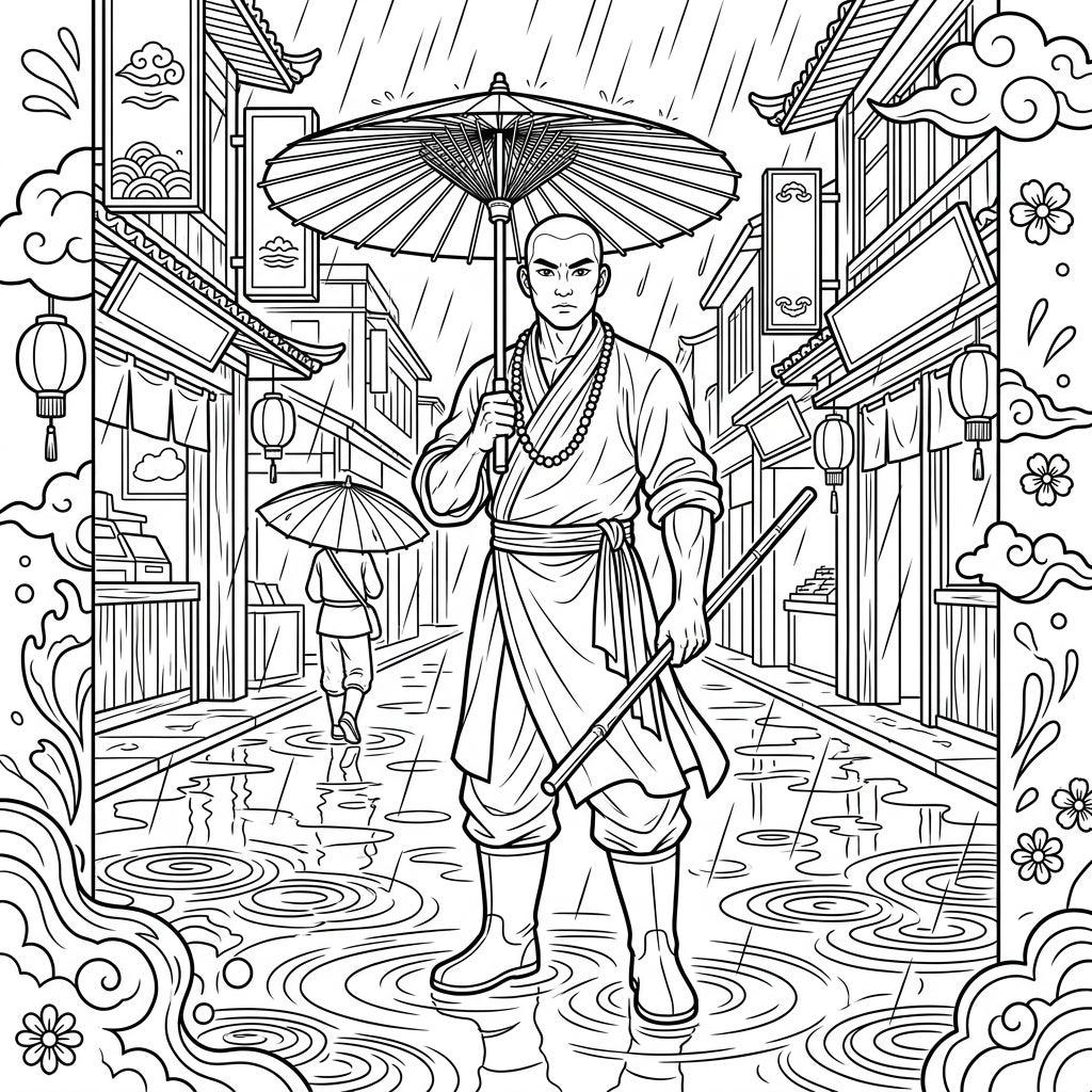 Bring this powerful image to life with your favorite colors! Experiment with cool blues and grays for the rain and reflective puddles, or warm earth tones for the monk's robes and the traditional buildings. Consider adding vibrant accents to the lanterns and umbrella to make them pop. This page offers countless possibilities to practice shading, create depth, and express your artistic interpretation of a Shaolin warrior's tranquil strength.