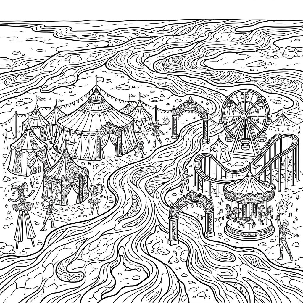 This isn't just any carnival; it's a fantastical realm where the joyous clamor of the big top meets the raw, primal energy of flowing lava. The high-spirited atmosphere of the fairground, filled with music, laughter, and dazzling acts, is given an unexpected edge by the swirling, powerful currents of the molten landscape. It invites you to imagine a world where natural forces and human entertainment collide, offering a coloring experience that is both exhilarating and deeply imaginative, challenging you to bring this extraordinary fusion to life.