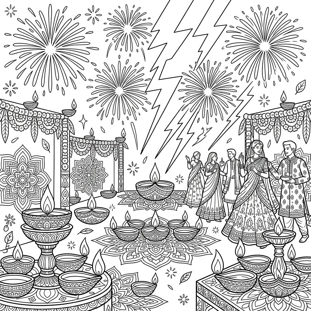 Unleash your creativity as you bring this festive scene to vibrant life. Experiment with bright, celebratory colors for the traditional attire, fireworks, and intricate rangoli designs, making them truly pop. Consider using warm yellows and oranges for the diya flames, creating a realistic glow against a deeper night sky. Don't forget to play with cool blues and purples to emphasize the distant sheet lightning, adding depth and contrast to this spectacular Diwali night.