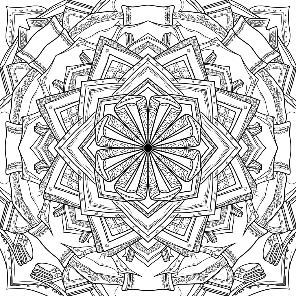 Prepare to be mesmerized by this one-of-a-kind coloring template, where the familiar comfort of sheet sets is transformed into a breathtaking mandala design. This intricate pattern features beautifully folded sheets, plush pillowcases, and decorative bedding elements, all meticulously arranged in perfect radial symmetry. Each section unfolds to reveal delicate textile patterns, subtle pleats, and elegant trims, creating a rich tapestry of details that begs for your creative touch.