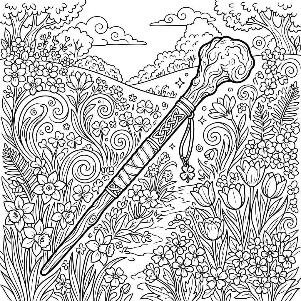 Journey into a beautifully detailed coloring scene centered around a traditional Irish shillelagh, often associated with folklore and luck. This sturdy walking stick, intricately designed with Celtic knotwork and textured details, rests gracefully within a rich tapestry of nature. Observe the delicate petals of blooming daffodils and tulips, intermingled with charming shamrocks and swirling leafy patterns that fill every corner of this vibrant illustration, inviting your creative touch.