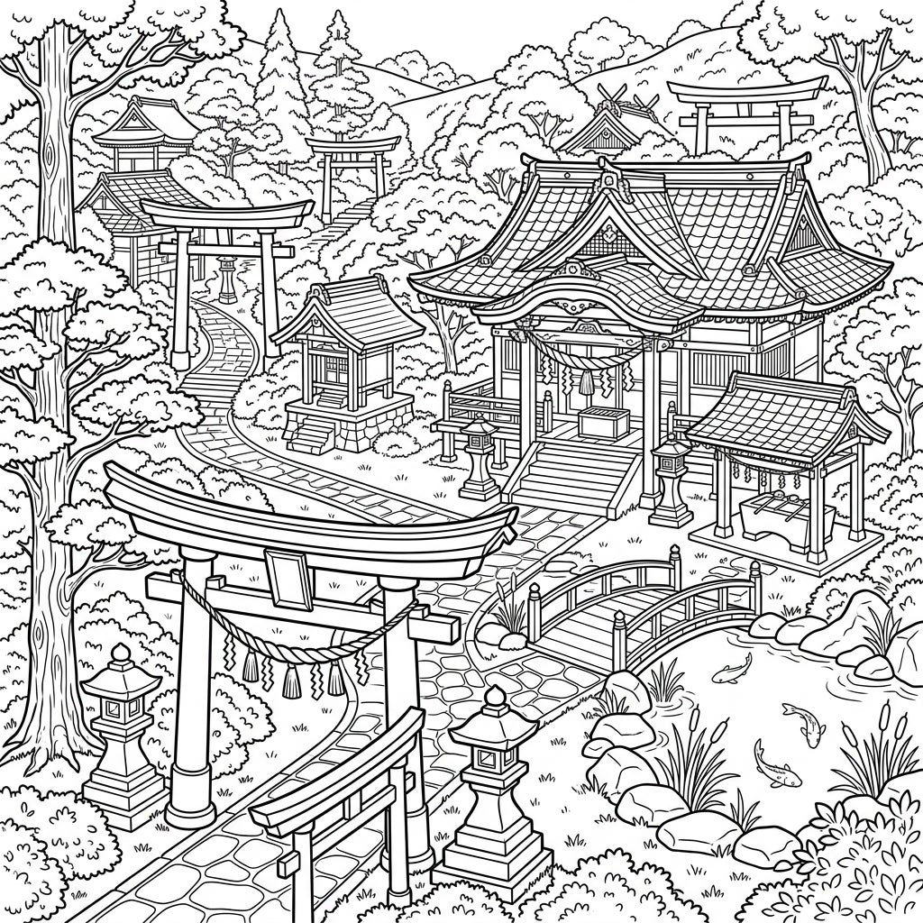 Step into the serene world of Japanese culture with this stunning full scene coloring page featuring majestic Shinto shrines. Explore intricate details from iconic torii gates to peaceful temple grounds, perfect for a relaxing and educational coloring experience.
