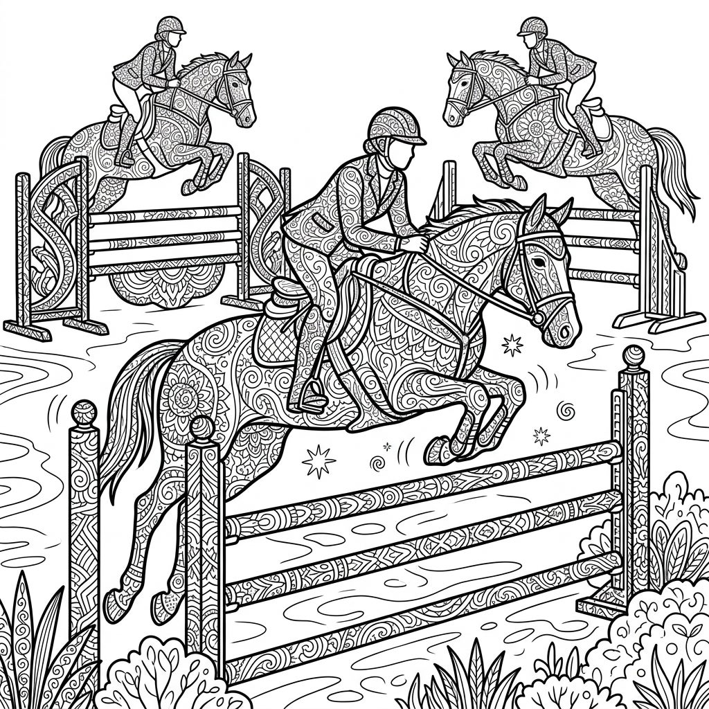 Dive into the exhilarating world of equestrian show jumping, reimagined with the mesmerizing details of Zentangle art! This unique coloring page captures three dynamic show jumpers and their majestic horses as they soar over elaborate obstacles. Every inch of the riders' outfits, the horses' bodies, and even the fences is meticulously filled with intricate, repetitive Zentangle patterns, offering a rich tapestry of lines and shapes just waiting for your creative touch.