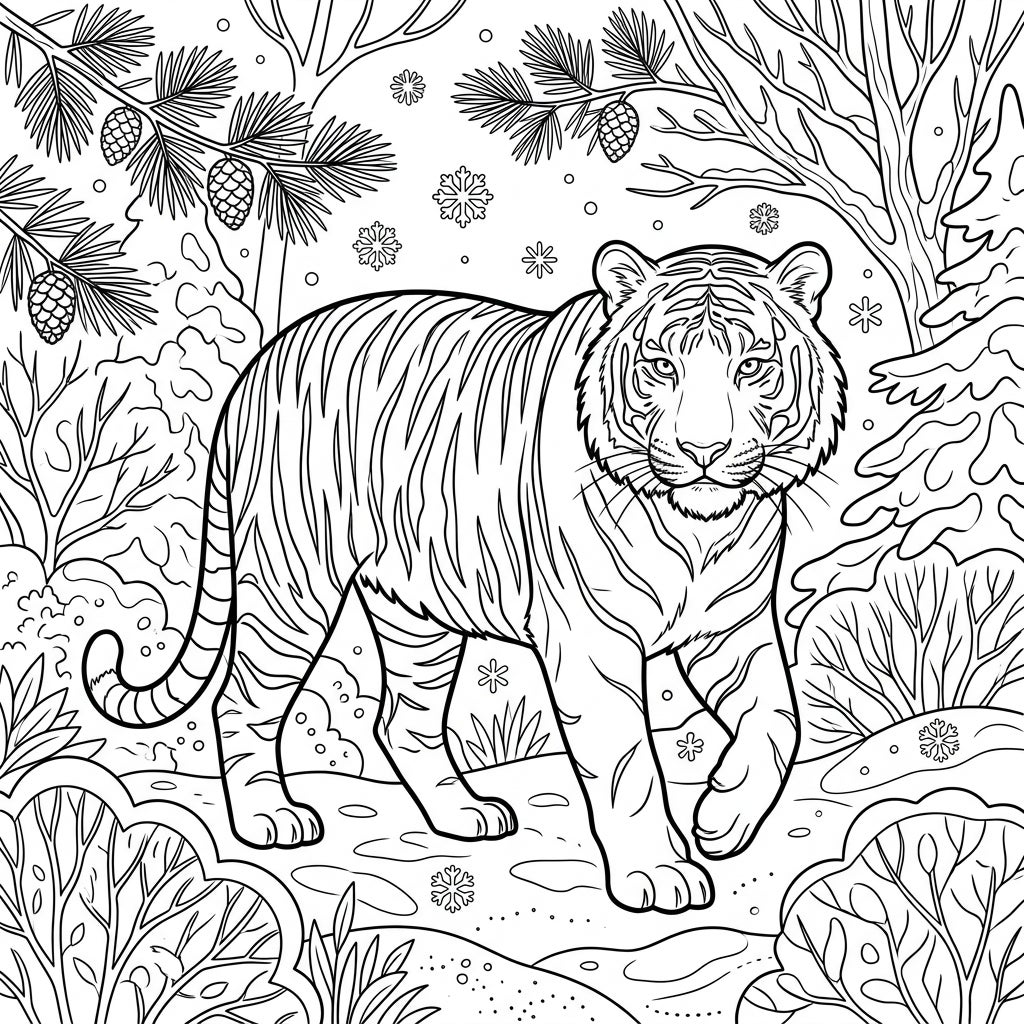 Step into a serene winter landscape where a magnificent Siberian tiger gracefully walks through a snow-dusted forest. This beautifully detailed coloring template showcases the tiger amidst a rich background of towering pine trees adorned with cones, delicate bare branches, and scattered snowflakes that evoke the crisp, cool air. Every element, from the tiger's distinctive stripes to the intricate foliage, is rendered with thick, clear outlines, ensuring a comfortable and enjoyable coloring experience.