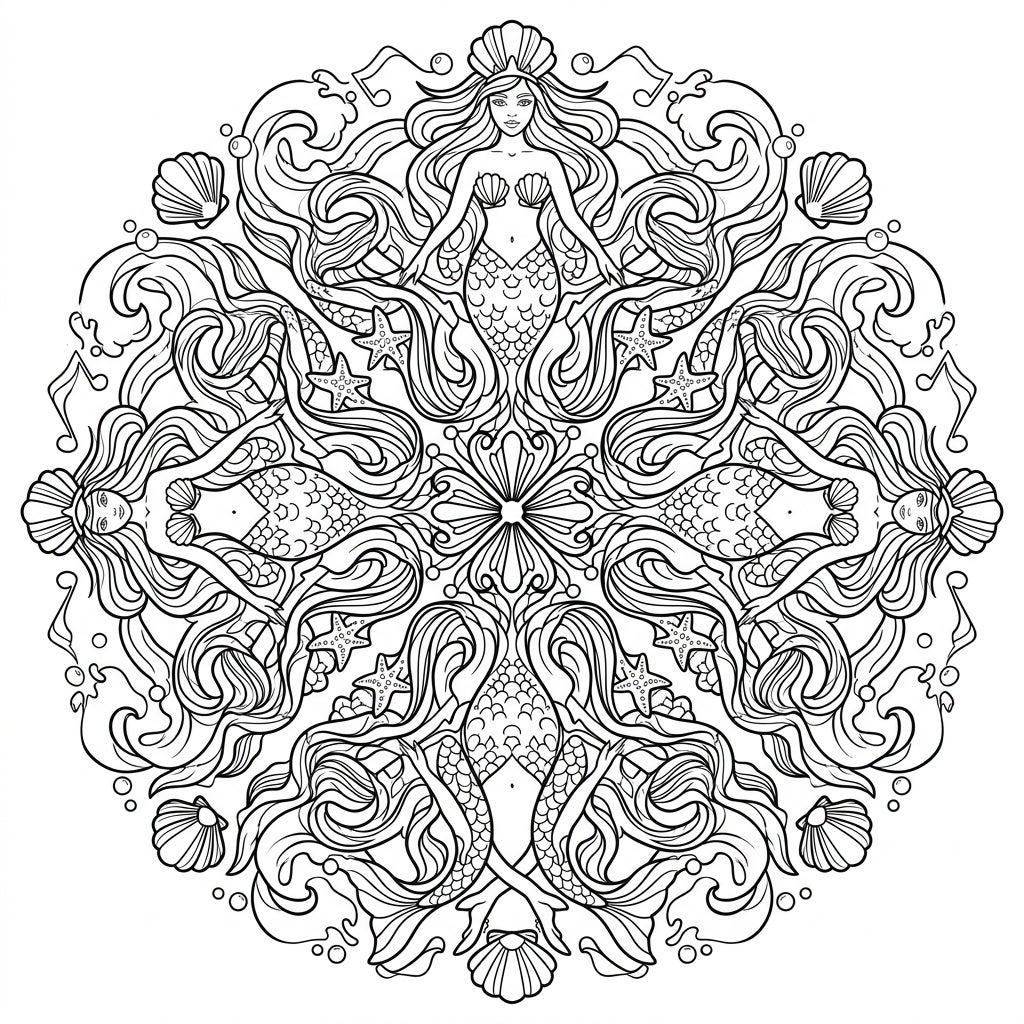 Immerse yourself in the intricate beauty of this Siren Mermaid Mandala coloring page. This stunning design features a harmonious arrangement of enchanting siren mermaids, each with flowing hair and scaled tails, gracefully intertwined within a complex radial pattern. Delicate seashells, whimsical starfish, and scattered musical notes adorn the watery elements, adding depth and thematic richness to every section of this captivating underwater scene.