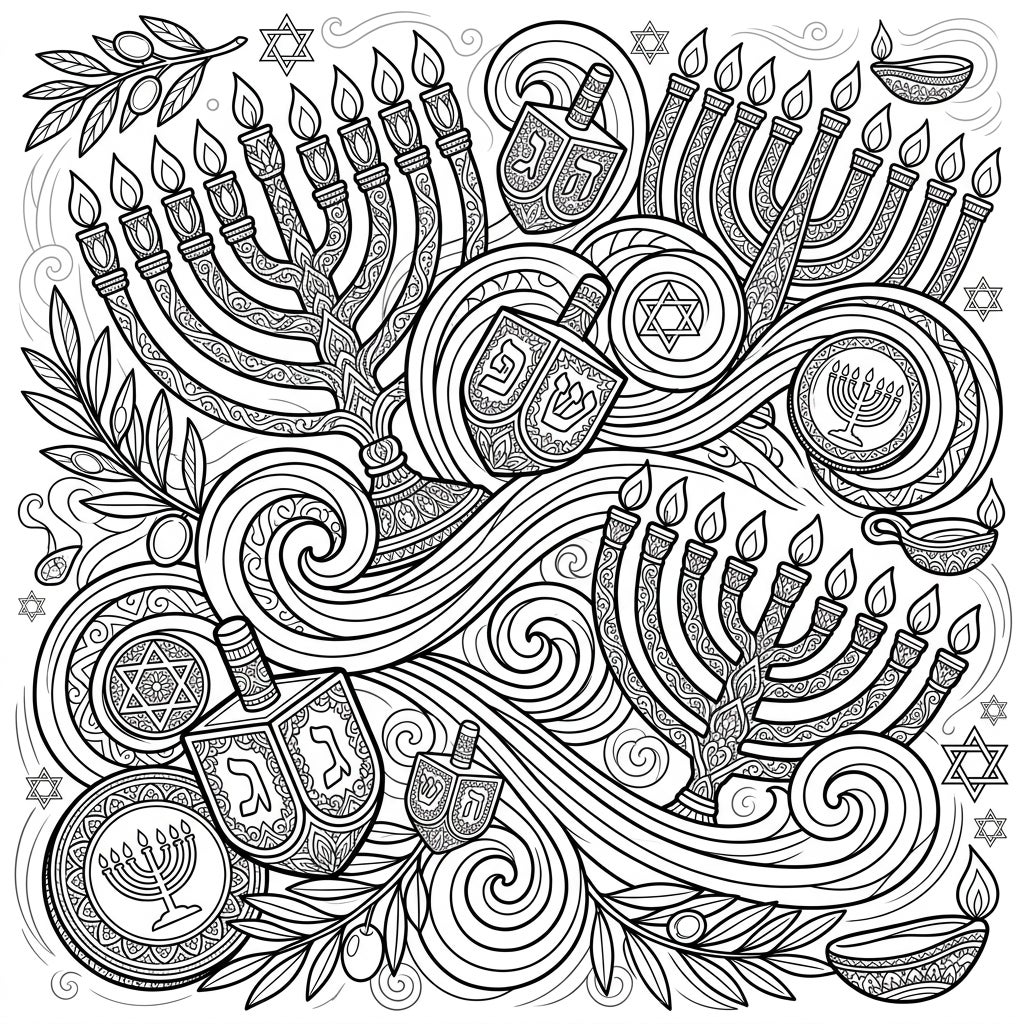 Dive into a richly detailed coloring experience where the dynamic force of the Sirocco wind meets the timeless traditions of Hanukkah. This full-page composition is a tapestry of intricate elements, showcasing multiple elegant menorahs, each adorned with delicate patterns and glowing candles, alongside playful dreidels ready to spin. Interspersed throughout are symbolic Stars of David and graceful olive branches, all carried aloft by beautifully rendered swirling wind currents that form the very fabric of the design.