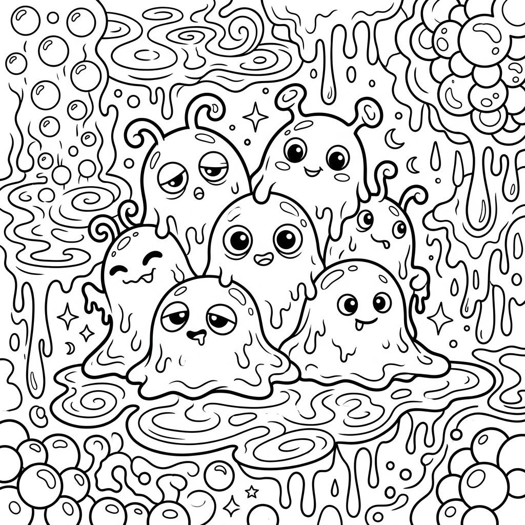 Embark on a delightful artistic journey with this captivating coloring page featuring a group of charming slime monsters. Each adorable blob boasts unique, expressive faces, from cheerfully grinning to playfully sleepy, nestled amidst a playful swirl of oozing patterns, whimsical bubbles, and sparkling stars. The thick, defined lines ensure a clear and enjoyable coloring experience, making every detail easy to fill.