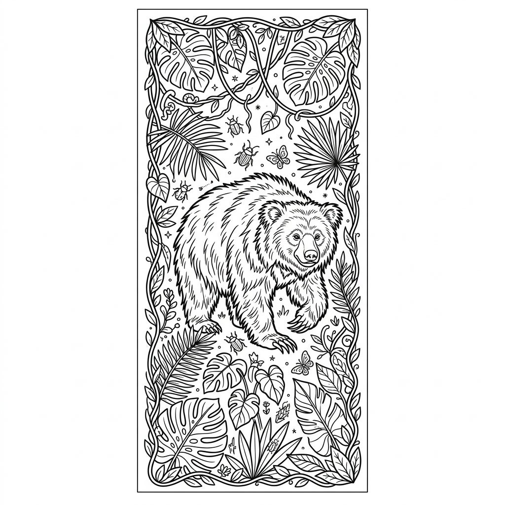 Embark on an artistic journey into the heart of the jungle with this exquisite sloth bear bookmark coloring page. At its core, a magnificent sloth bear, with its characteristic shaggy fur and impressive claws, stands poised amidst a vibrant ecosystem. The vertical composition is richly framed by an abundance of tropical leaves, including broad monstera and delicate palm fronds, all intertwined with winding vines, creating a dense and immersive natural habitat.