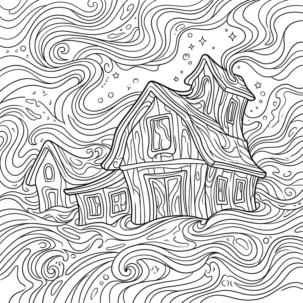 Step into a whimsical world where humble small barns transcend their ordinary form, transformed by a vibrant psychedelic vision. This intricate coloring page features two charming barn structures, rendered with delightful wood grain patterns that seem to flow and undulate. They are nestled within an expansive landscape of swirling lines and organic shapes, creating a captivating sense of movement and depth. Look closely and you'll discover scattered stars and playful circles tucked amidst the dreamy currents, inviting you to explore every curve and contour.