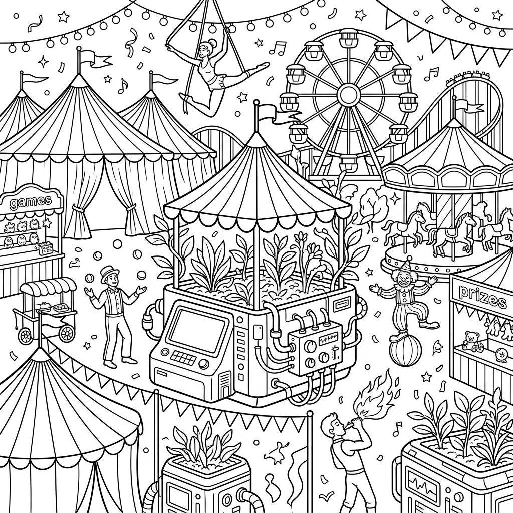 Step right up to a one-of-a-kind carnival experience where the future of gardening meets classic fairground delights. This intricate coloring page blends the joy of a bustling circus with innovative smart planter technology for an unforgettable artistic adventure.