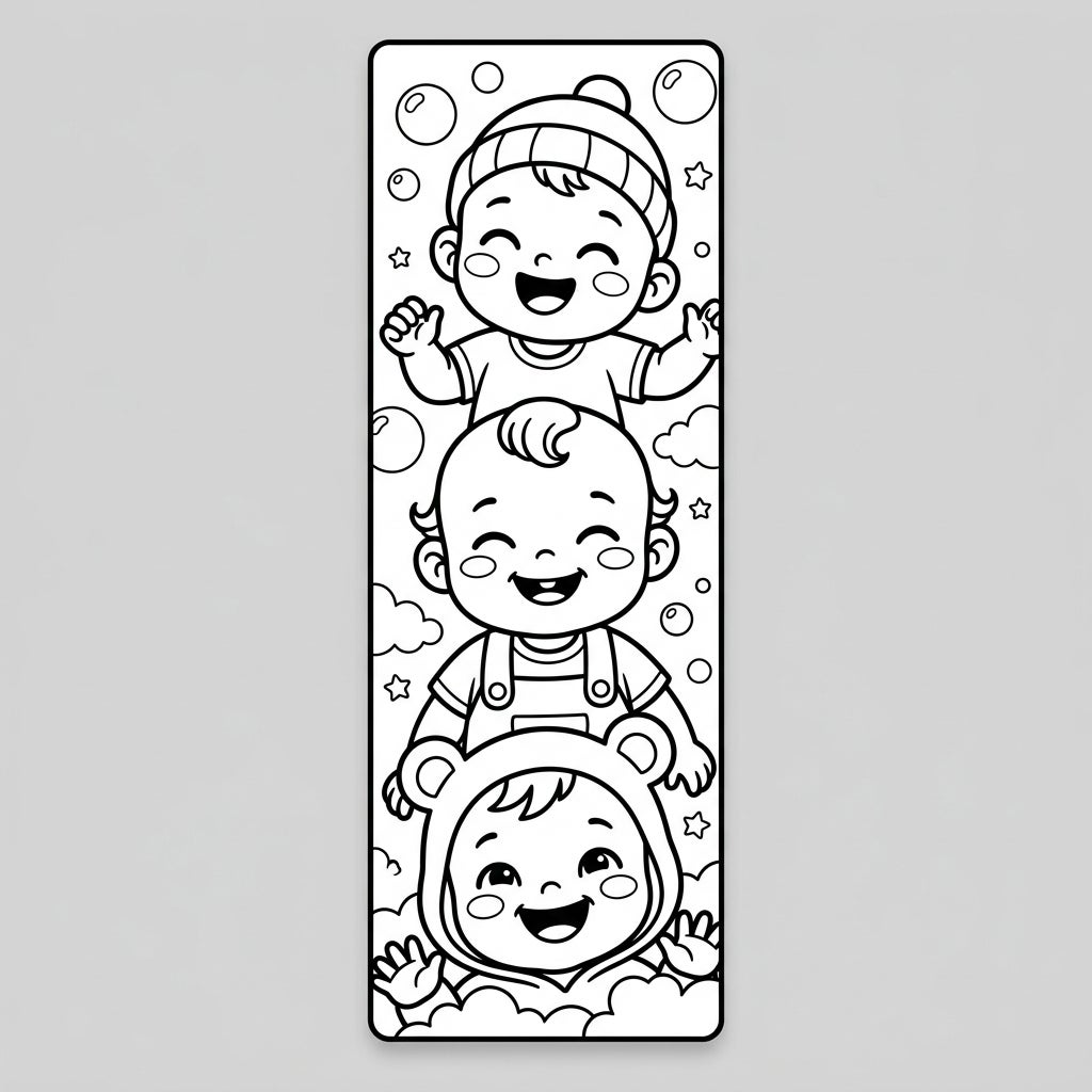 Unwrap a bundle of joy with this charming bookmark coloring page, perfectly designed to brighten your day and your books. This template showcases a heartwarming trio of smiling babies, stacked playfully in a vertical arrangement. Each baby beams with infectious happiness; the top one dons a cozy striped hat, the middle infant is dressed in cute overalls, and the bottom little one is snug in an adorable bear-hooded onesie. The background is sprinkled with simple, delightful elements like floating bubbles, tiny stars, and soft, whimsical clouds, creating a dreamy setting.