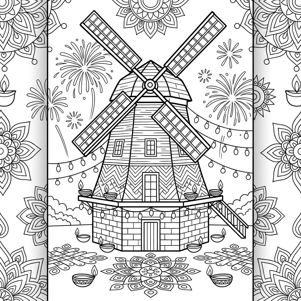 Unleash your creativity and make this festive artwork truly shine. Experiment with bright, vibrant colors for the diyas and fireworks to truly capture the brilliance of Diwali. Consider using warm earthy tones for the smock mill itself, contrasting with the vivid hues of the rangoli and surrounding decorative patterns. Whether you prefer bold markers, soft pencils, or shimmering gels, this detailed design provides ample space for personal expression and a relaxing, fulfilling coloring experience.