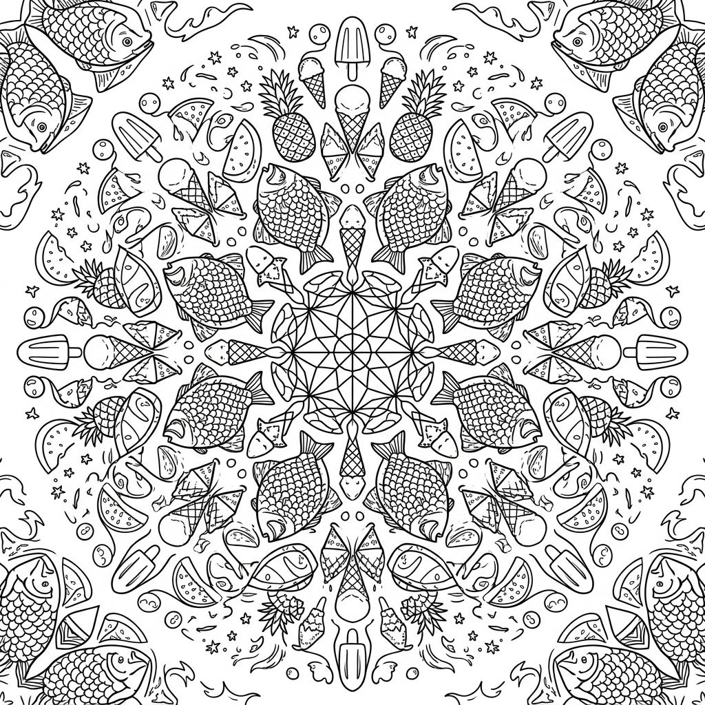Unleash your creativity with this spectacular Snapper Fish Summer Mandala coloring page! This captivating design radiates from a central point, showcasing perfectly symmetrical arrangements of cheerful Snapper fish, juicy pineapples, refreshing watermelon slices, classic ice cream cones, and delightful popsicles. Every element is intricately placed to fill the page, offering a rich and detailed canvas for your artistic expression.