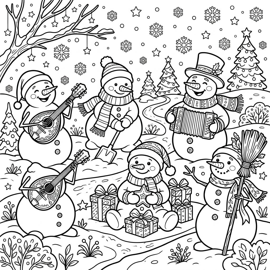 Dive into a delightful winter wonderland with this charming coloring page, featuring a lively group of snowmen engaged in festive activities. From playing musical instruments to opening presents, there's a heartwarming scene waiting for your creative touch.