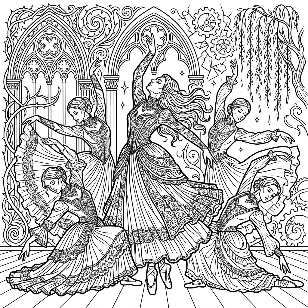 Dive into a world of dramatic beauty with this intricate coloring page featuring gothic dancers. Each elegant pose and ornate gown tells a story of societal reflection, offering a unique artistic challenge.