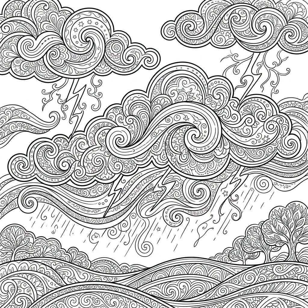 Discover tranquility with this beautifully intricate Soft Thunder adult coloring page, designed to soothe and inspire. Dive into a detailed world of swirling clouds and gentle rain, perfect for mindful relaxation.