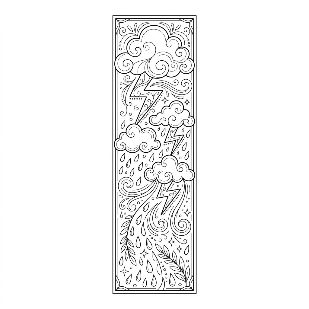 This captivating coloring bookmark template invites you to explore the subtle beauty of a gentle storm. The design showcases beautifully stylized clouds, each detailed with swirling patterns, alongside elegantly rendered lightning bolts that pierce through the composition. Delicate raindrops cascade down, interspersed with intricate dotted motifs and flowing wind-like swirls, all framed within a classic bookmark shape.