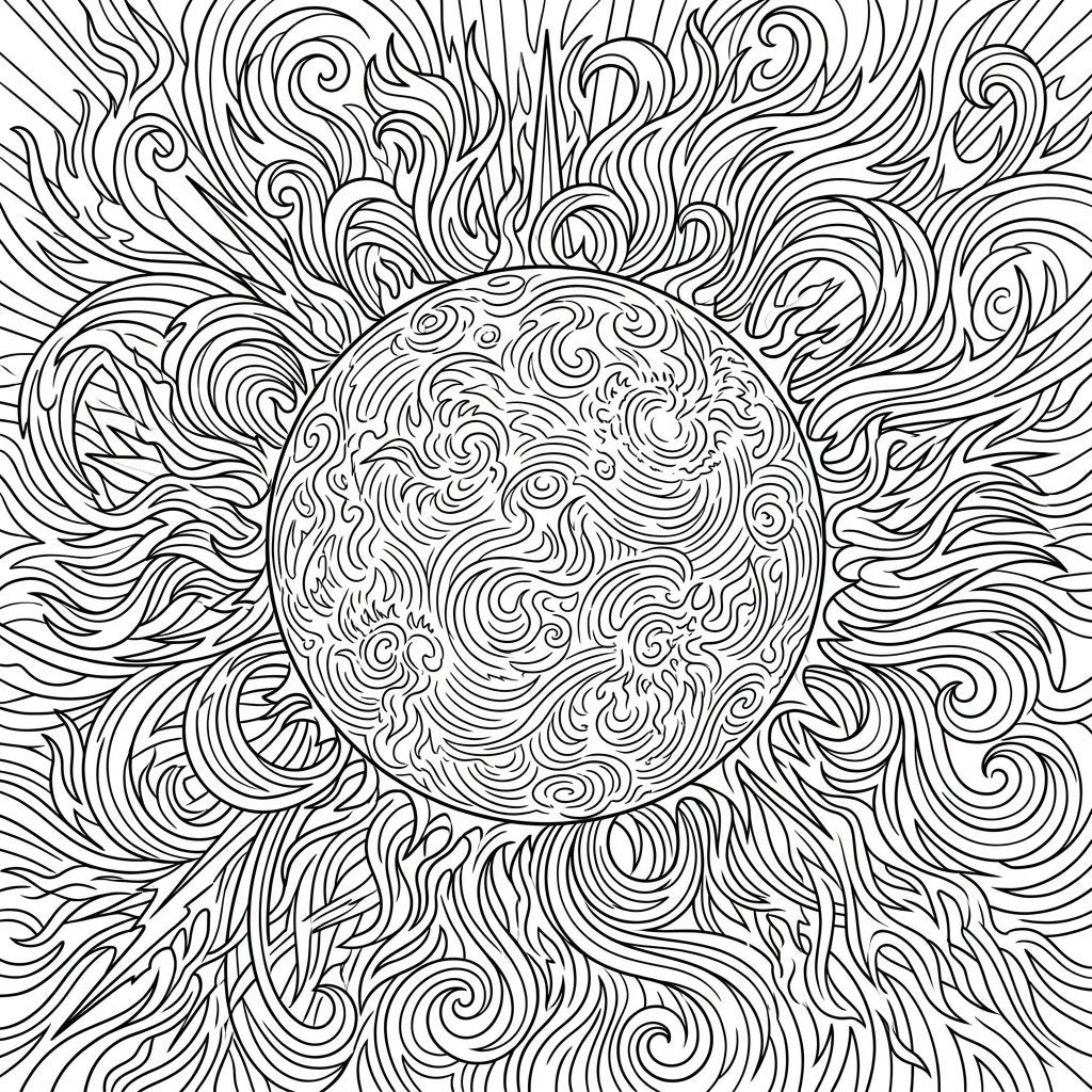 Explore the mesmerizing energy of the sun with this intricate solar flare patterns coloring page. Its dynamic lines and swirling designs offer a captivating and detailed artistic challenge.