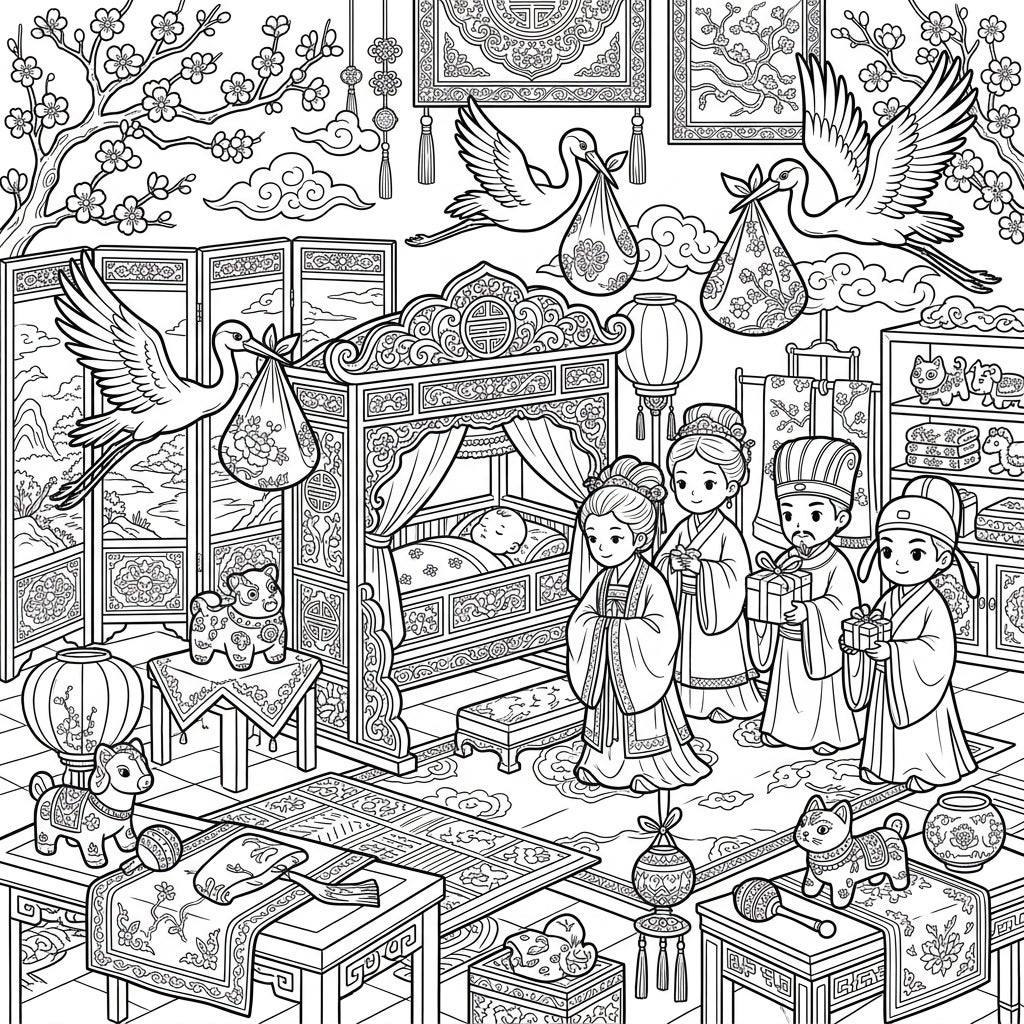 Journey back to a prosperous era with this exquisitely detailed Song Dynasty Baby Shower coloring page. This intricate scene captures the anticipation and joy of welcoming a new life, featuring a newborn nestled in a magnificent, elaborately carved four-poster bed. Elegant storks soar above, gracefully delivering bundles of joy, while family members in traditional Hanfu attire gather, bearing thoughtful gifts. Every element, from the patterned screens to the decorative lanterns and blossoming cherry branches, is steeped in the refined aesthetics of ancient China, offering a truly immersive coloring experience.