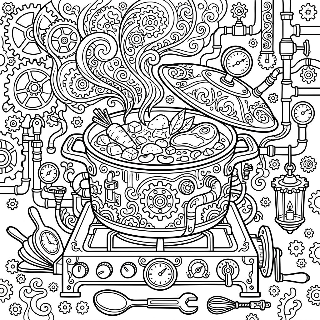 Beyond the simmering stew, the entire scene is a bustling tableau of industrial fantasy. Swirling steam from the pot transforms into intricate patterns of cogwheels and cogs, pipes crisscross the background, and various gauges monitor unseen processes, creating a dense and immersive world. This fusion of hearty, homely food with the adventurous spirit of Steampunk offers a captivating narrative, inviting colorists to imagine a world where every meal is an invention.