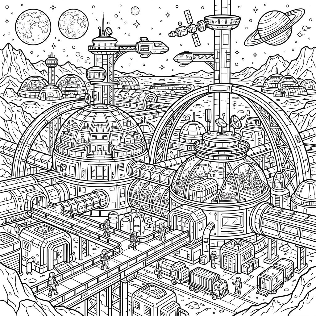 Step into a breathtaking vision of the future with this captivating Space Colony coloring page. This intricate full-scene landscape transports you to a bustling human settlement nestled on an alien world, featuring magnificent domed habitats, interconnected tubes, and elevated walkways where pioneering astronauts journey. Every corner is meticulously detailed, from the futuristic vehicles transporting supplies to the towering communication arrays and observation decks, all set against a dramatic backdrop of rugged mountains and distant celestial bodies.