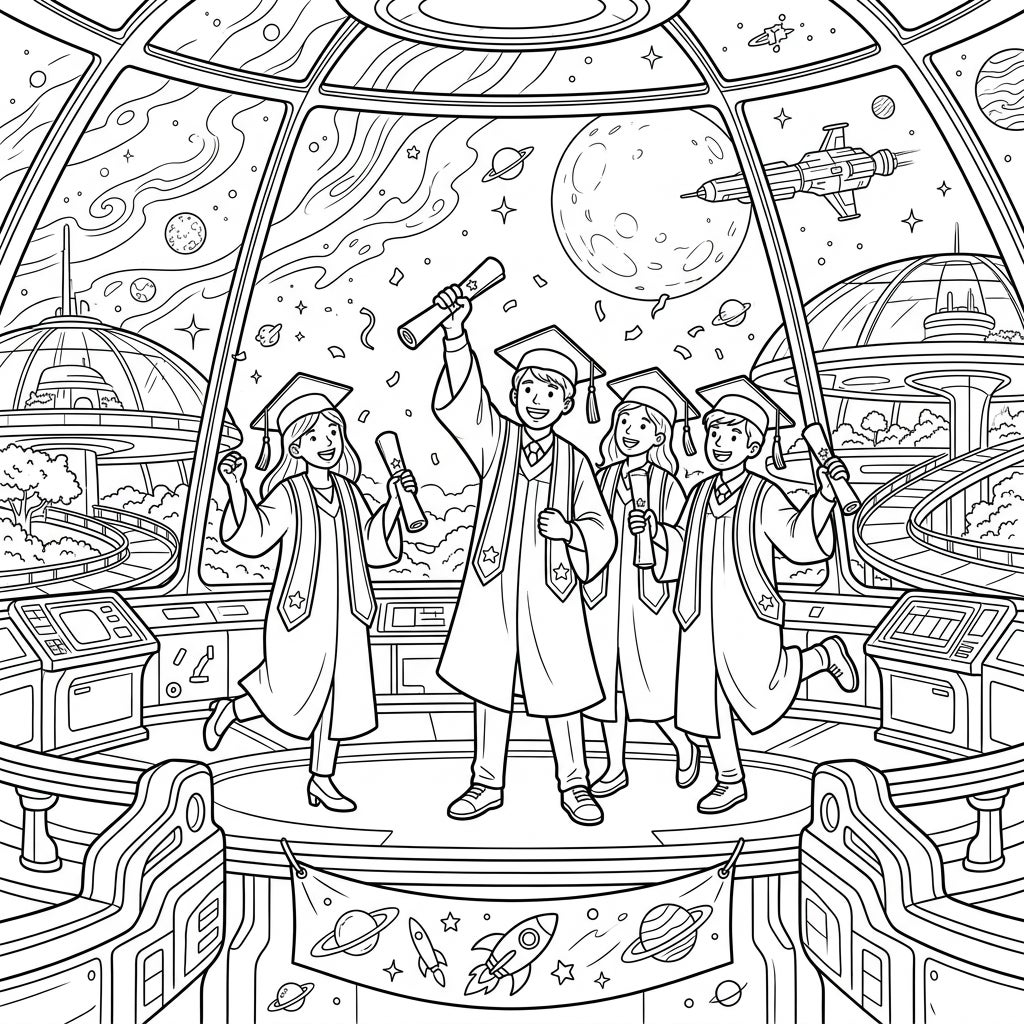 Journey to the stars for a unique graduation ceremony with this exciting coloring page. Watch as jubilant students celebrate their achievements in a vibrant, futuristic space colony.