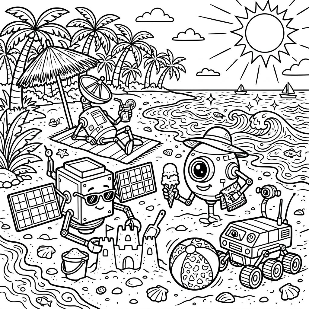 Dive into an extraordinary summer scene where advanced space probes trade the vacuum of space for the warmth of a sandy beach! This intricately designed coloring page showcases a playful assembly of robotic explorers enjoying all the classic vacation delights. You'll find one chill probe lounging under a classic beach umbrella, sipping a refreshing drink, while another, sporting cool sunglasses, is busy constructing an impressive sandcastle complete with flags. Look closer, and you'll spot a charming spherical robot in a sun hat, happily clutching a melting ice cream cone and a beach towel, with a sturdy lunar rover nearby, ready for some beach ball action.