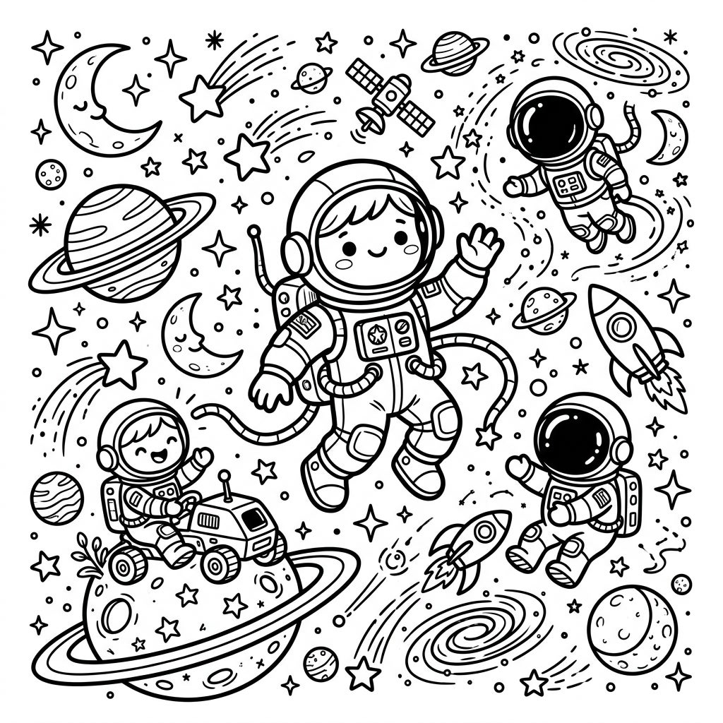 This enchanting coloring page transports you to a whimsical universe, bustling with adorable kawaii-style astronauts exploring the vastness of space. Each rounded astronaut, with their simple, friendly face and thick outlines, invites you to join their cosmic journey. The scene is rich with thematic elements, showcasing planets with rings, charming crescent moons, sparkling stars, shooting comets, sleek rockets, and even a satellite, all rendered in an irresistibly cute Japanese-inspired aesthetic. One astronaut waves playfully, another cruises on a moon rover, and a third floats serenely, providing a dynamic yet harmonious composition.
